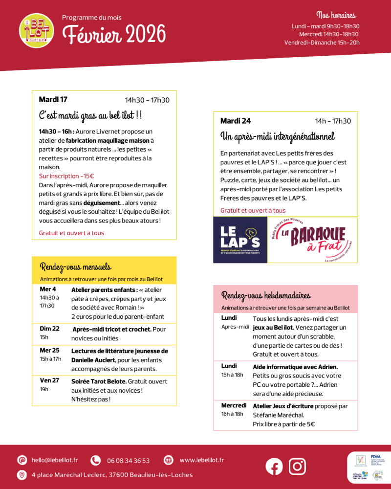 - Samedi 14 février 18h : ouverture du Bel îlot pour fêter la chandeleur et