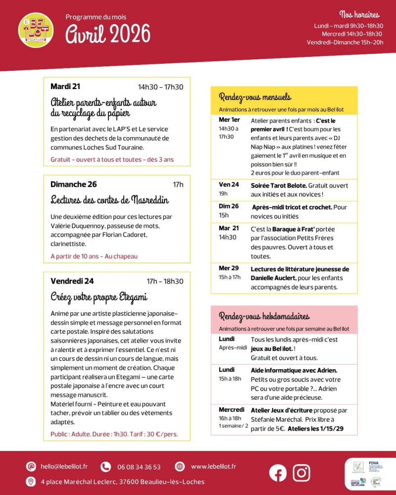 - Tous les lundis après-midi c’est jeux au Bel îlot . Venez partager un moment autour d’un scrabble, d’une partie de cartes ou de dés ! Gratuit et ouvert à tous.
