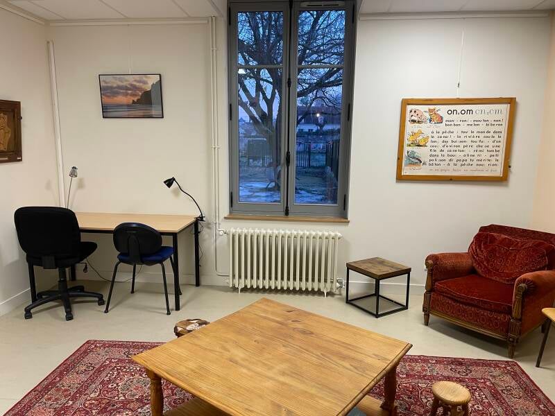 Elle dispose d'un grand mur clair permettant de projeter des documents mais aussi d'un point d'eau. Séparée de la grande salle, elle permet de travailler au calme tout en étant dans un esprit de lien social.